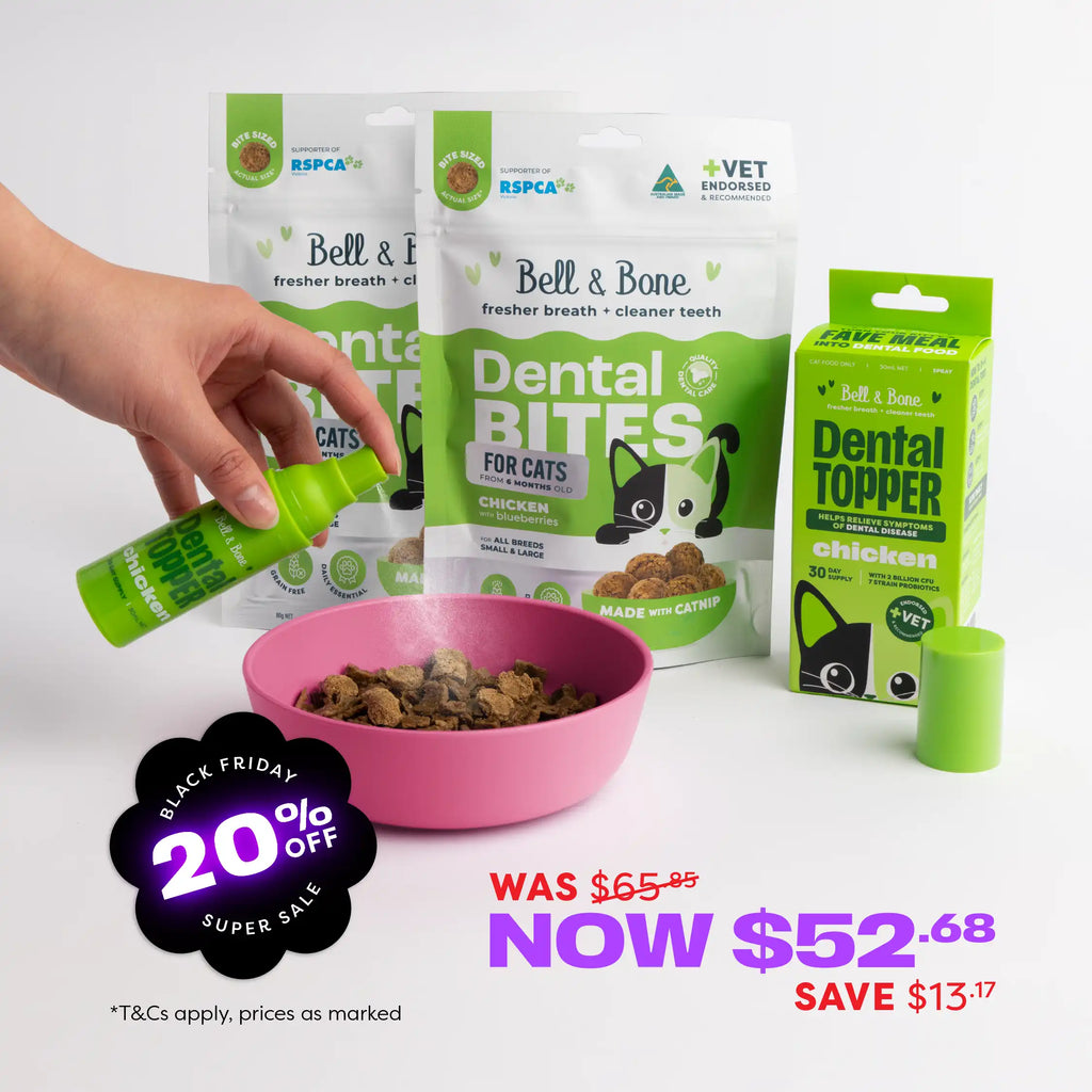 The Bell & Bone Dental Topper is a first-of-its-kind oral health spray designed to support both dental and gut health in pets. Applied directly onto your dog or cat's regular meals, it combines powerful oral actives, prebiotics, probiotics, postbiotics, and superfoods to help prevent plaque, tartar, bad breath, and inflammation—starting from the inside out.