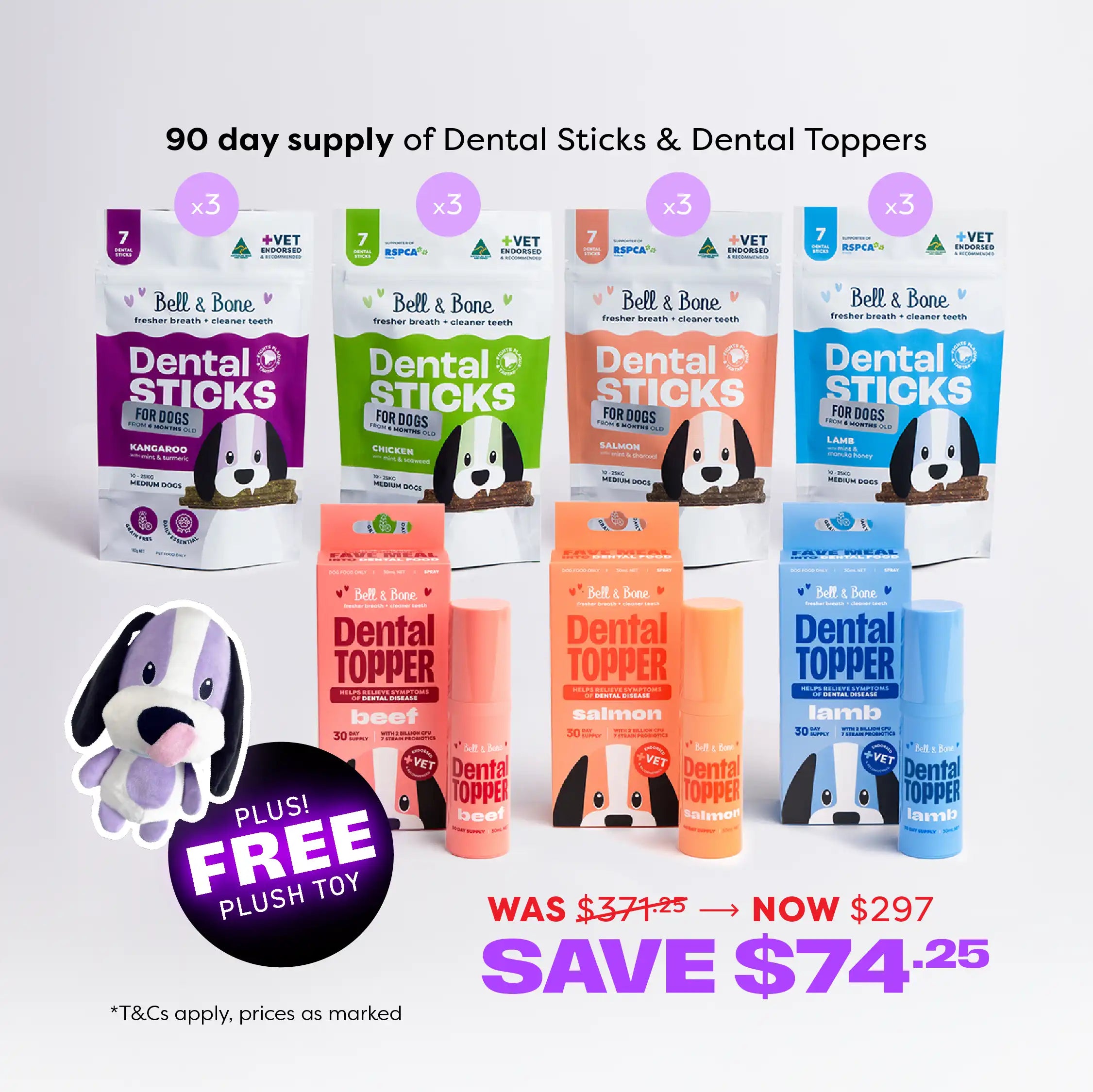 Yes! Together, they make the Perfect Dental Care Solution! The Dental Topper helps prevent plaque and tartar by targeting bad gut bacteria that contributes to dental disease, while the Dental Sticks help remove existing build-up through chewing. When used together, they help reduce plaque, freshen breath, and support your pup’s long-term oral and overall wellbeing.
