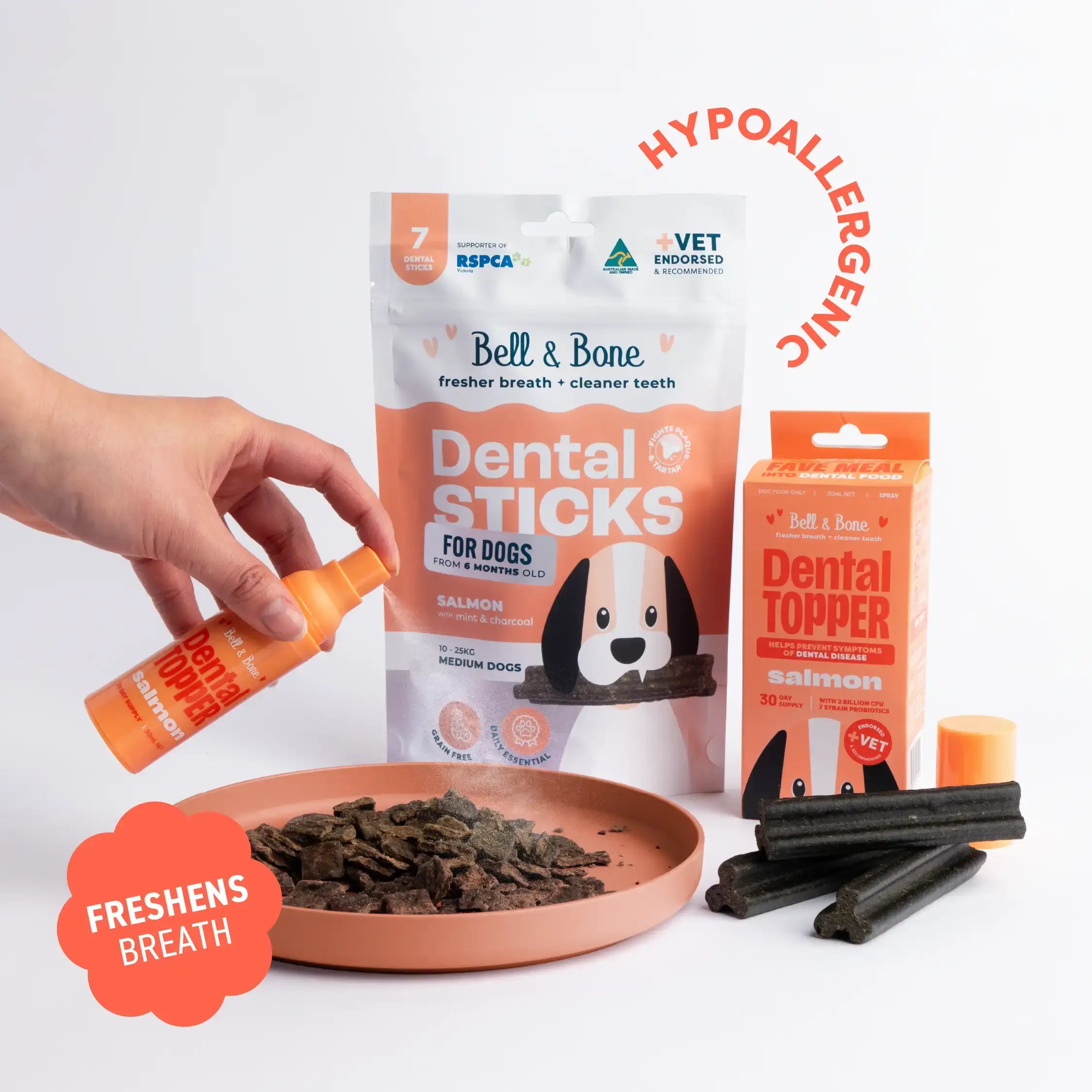 Give your sensitive pup the dental care they deserve with our Salmon Dental Bundle, specially designed for dogs with allergies or intolerances. This bundle includes Bell & Bone’s Salmon Dental Sticks and Salmon Dental Topper — a powerful daily routine that supports clean teeth, fresher breath, and a healthier gut.