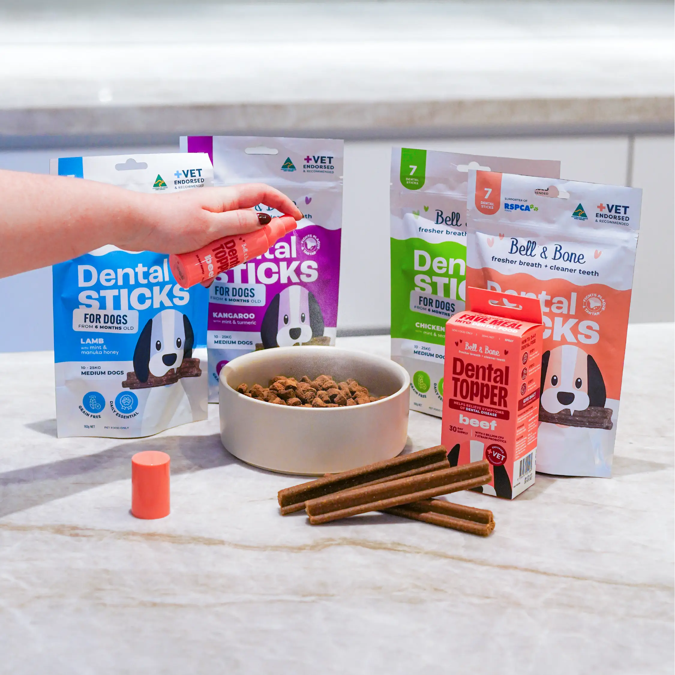 Lucky for you our Dental Toppers are made with fussy pups in mind! They’re highly palatable with a mild flavour designed to complement your pup’s food, not change it! If your pup is a little unsure at first, simply start with one spray and gradually build up to the full serving, it won’t be long before they’re licking the bowl clean!