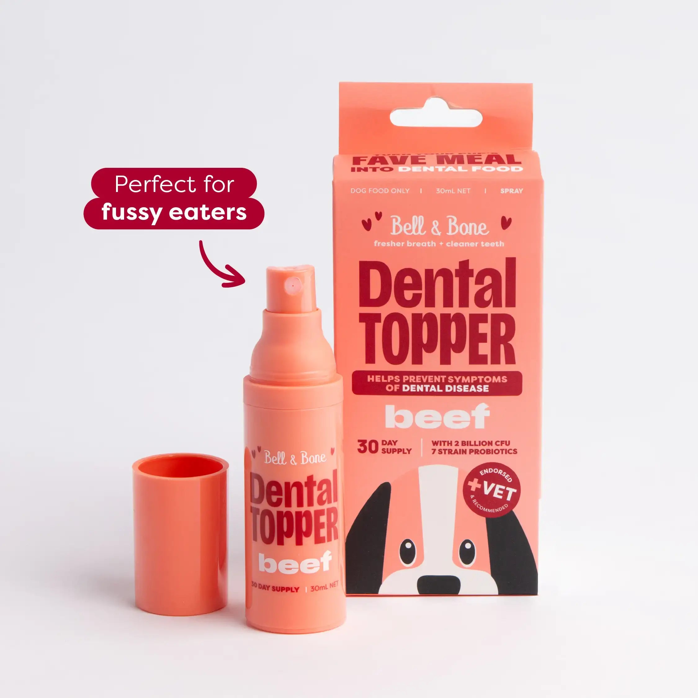 Lucky for you our Dental Toppers are made with fussy pups in mind! They’re highly palatable with a mild flavour designed to complement your pup’s food, not change it! If your pup is a little unsure at first, simply start with one spray and gradually build up to the full serving, it won’t be long before they’re licking the bowl clean!