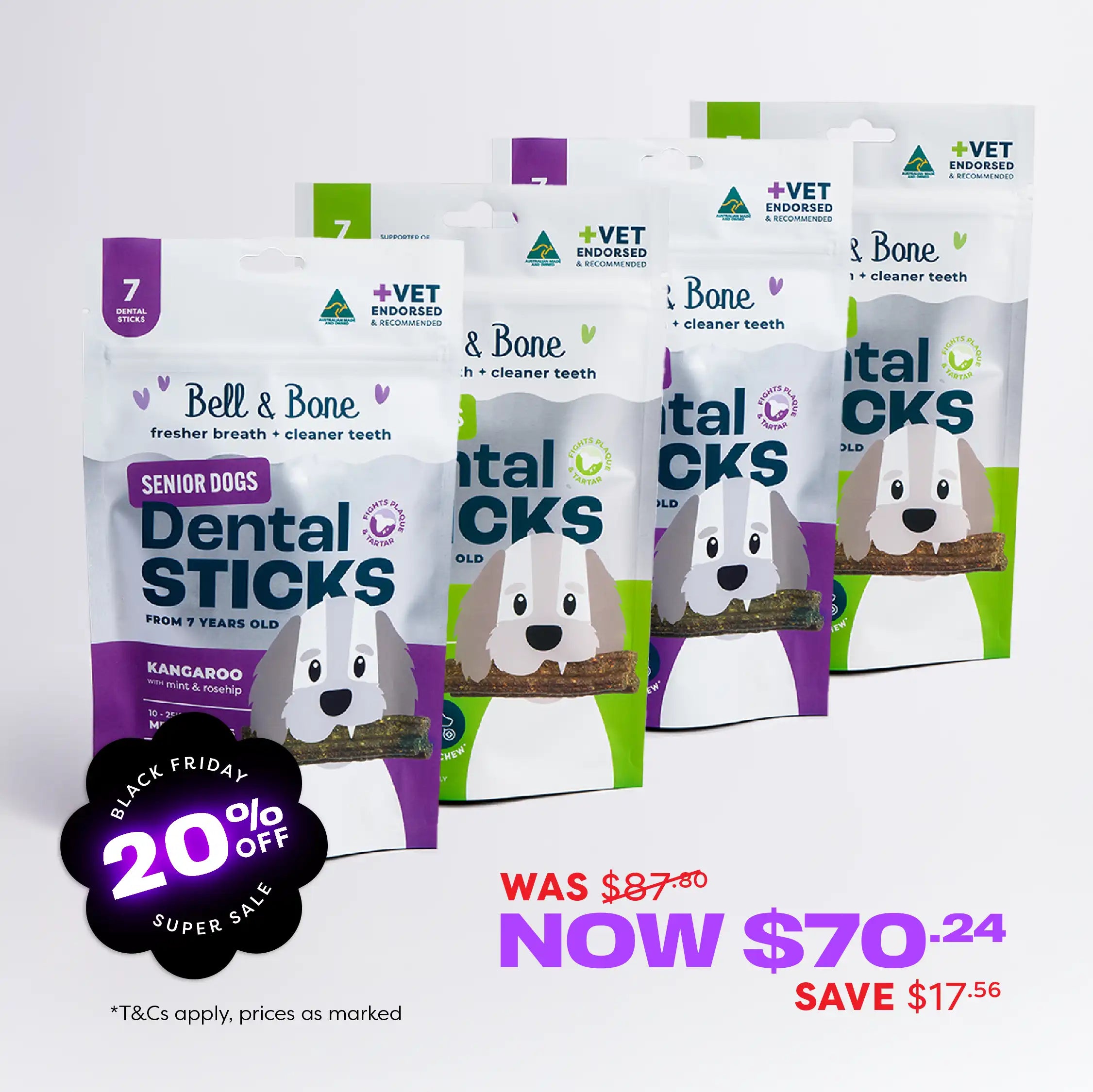 Bell & Bone Dental Sticks are one of the few Australian brands that contain active ingredients known to prevent and reduce plaque and tartar. Working with industry experts, Bell & Bone has included Sodium Tripolyphosphate and Zinc Sulphate in their range of dental sticks. These ingredients will activate when your dog chews on their dental stick to provide them with optimal oral care.